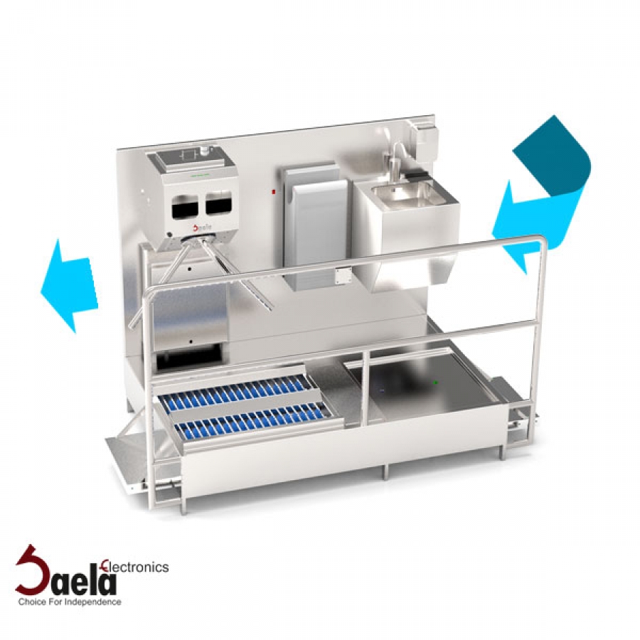 دستگاه فوق بصورت تمام خودکار و بدون تماس دست توانایی انجام امور خود می باشد تا از انتقال آلودگی از فردی به فرد دیگر جلوگیری کند و در مدت زمان کوتاه افراد را باد دست و کفش پاکیزه وارد سالن می کند.