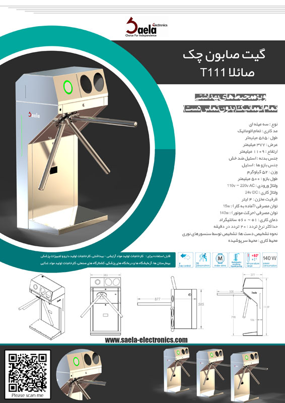 گیت ضدعفونی دست Saela T111 یکی از ابزارهای کنترل و مدیریت تردد بهداشتی می باشد. کاربرد گیت بهداشتی برای بیمارستان ها و مراکز درمانی، بهداشتی و غذایی در کنترل بهداشت دست می باشد، در این مراکز برای رعایت بهداشت و جلوگیری از پخش میکروب و باکتری از طریق دست ها باید از دستگاه کنترل شستشوی دست استفاده شود، از این گیت بعضا با نام های گیت بهداشتی، گیت بیمارستانی، گیت اتاق عمل و گیت ضد عفونی دست شناخته می شود.